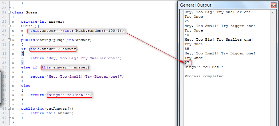 | Guess方法定義猜太大、太小或猜對的處理,正確答案用random*100+1取整數產生 |