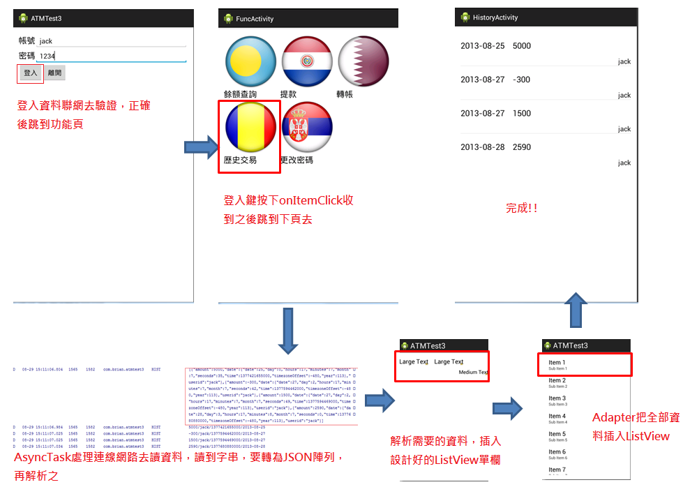 整件事情現在整理起來是很恐怖的!! 一個簡單的功能,背後代表了相當多的邏輯和程式、畫面的設計,從登入開始,帳號密碼按下登入後,到資料庫去驗證,正確的話在進入下一個功能頁,進入功能頁,按下歷史交易,在連上網去查資料,查到JSON陣列,在解析需要的資料,同時去設計想要呈現的畫面,組成ListView,最後把全部查完的資料,插入ListView中,完成這個功能。Gosh!! 真的超多工作!!